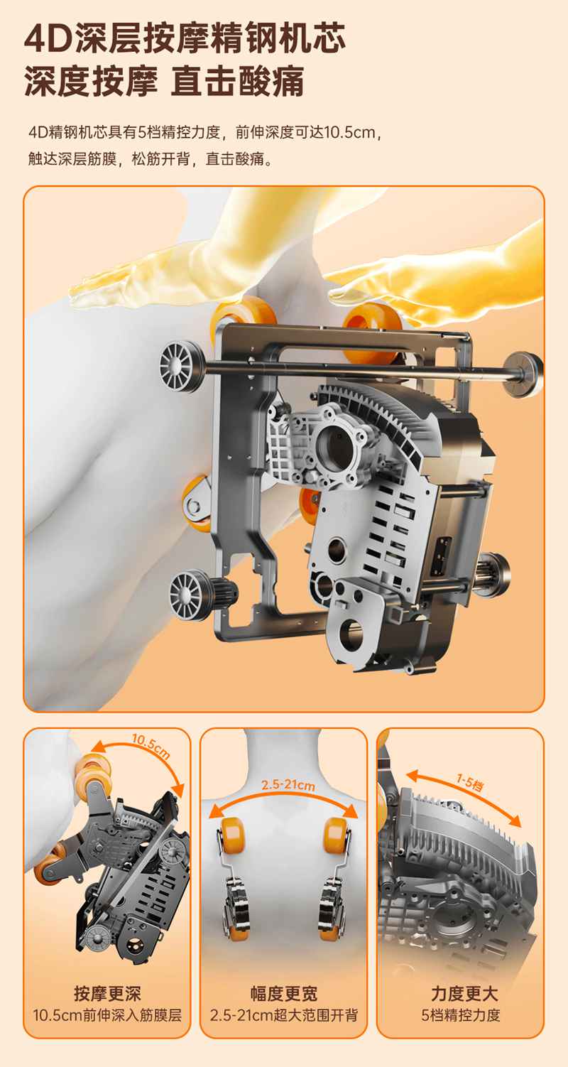SH-M950 高端运动放松椅四大独家特色运动放松程序Y轻松搞定各种疲劳,20+按摩放松模式,提供多样化的按摩模式和力度调节,满足不同场景下的放松需求,4D深层按摩精钢机芯及3D气揉机芯;双机芯同时运作Y肩颈腰背臀腿同时按摩Y带来更全面舒爽的按摩体验,5档精控力度,前伸深度可达10.5cm触达深层筋膜Y松筋开背Y直击酸痛。