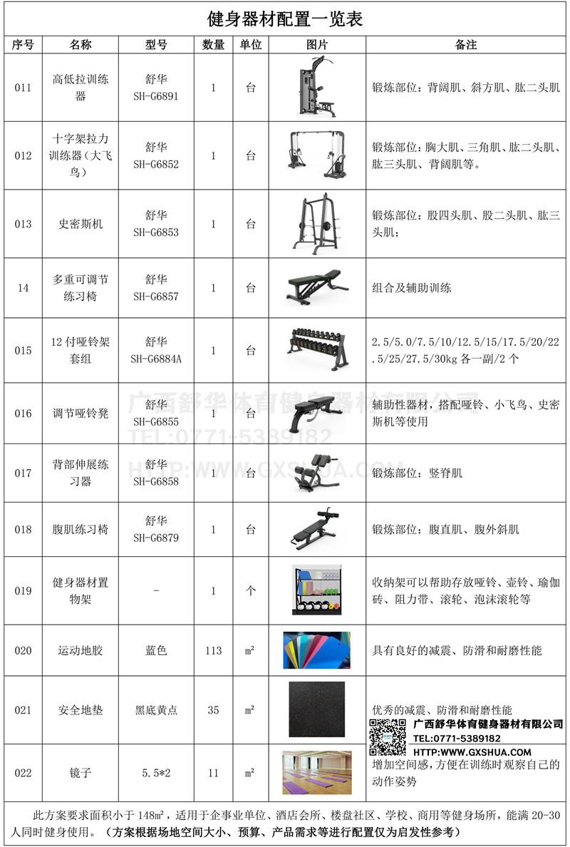 此方案要求面积小于148m²,适用于企事业单位、酒店会所、楼盘社区、学校、商用等健身场所,能满20-30人同时健身使用。(方案根据场地空间大小、预算、产品需求等进行配置仅为启发性参考)