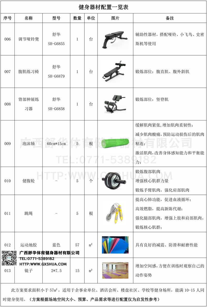 此方案要求面积小于57m²,适用于企事业单位、酒店会所、楼盘社区、学校等健身场所,能满10-15人同时健身使用。(方案根据场地空间大小、预算、产品需求等进行配置仅为启发性参考)