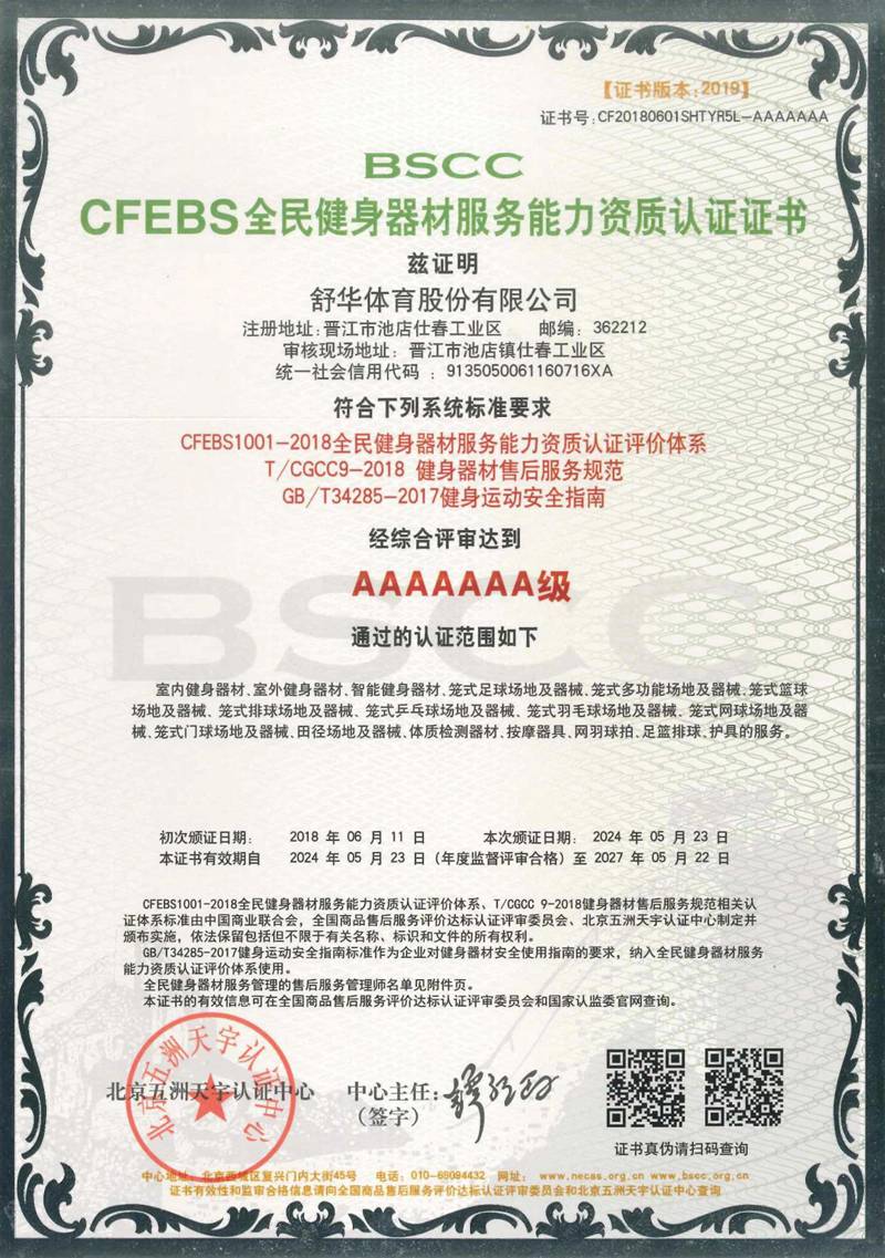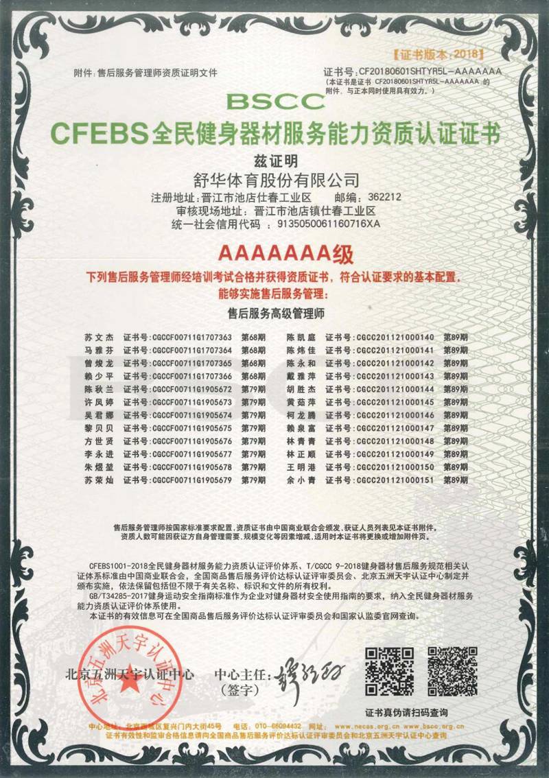 mk体育以用户满意作为服务追求,凭借专业的技术能力及服务保障能力、有效的售后服务体系,获得“BSCC-CFEBS 全民健身器材服务能力资质认证证书 AAAAAAA 级”,部分员工经培训考试合格并获得“BSCC-CFEBS 全民健身器材服务能力资质认证证书-售后服务高级管理师(AAAAAA 级)。